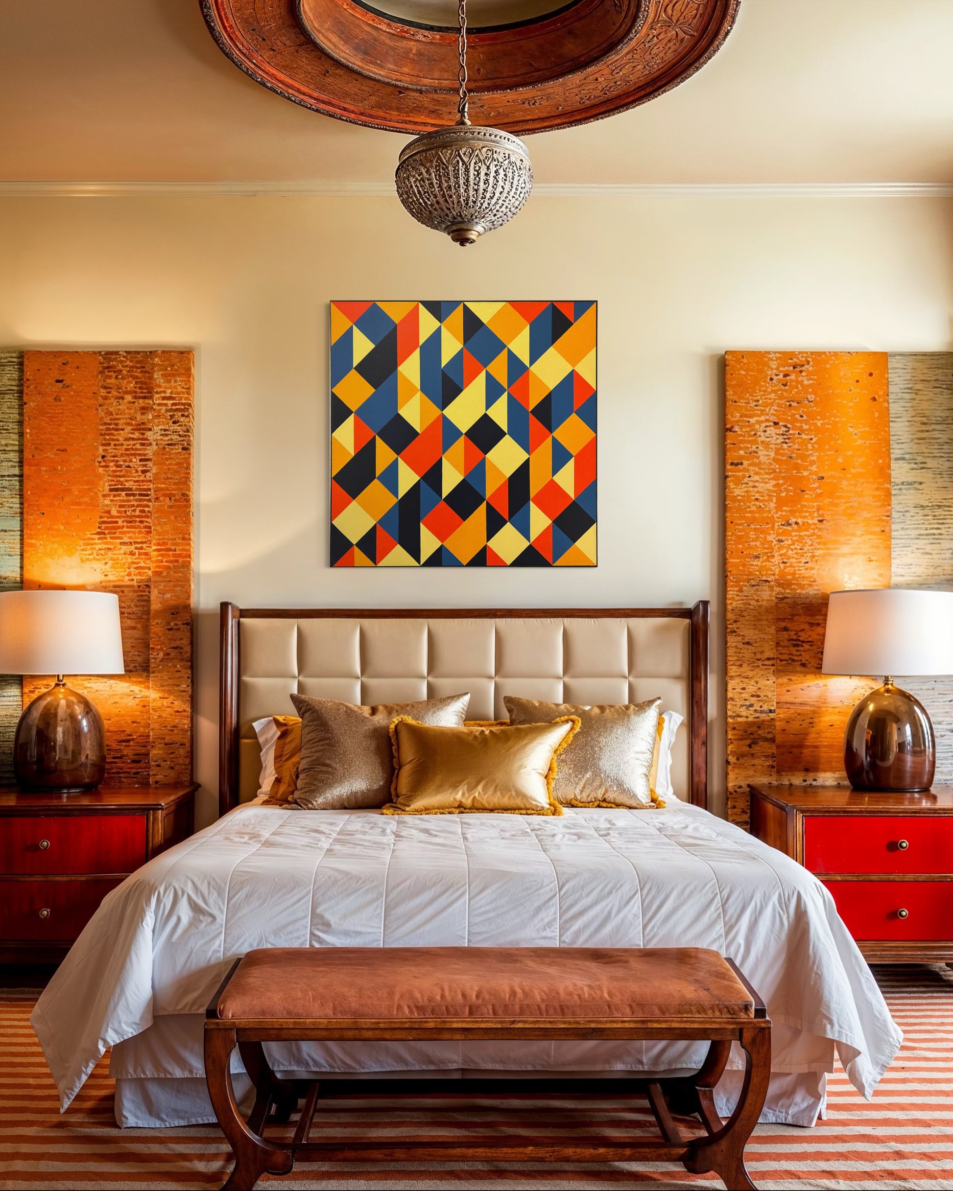 Rebecca Coleman’s work explores contemporary geometric abstraction through carefully balanced color, rhythm, and form. Each composition is entirely hand-painted, created without the use of tape or mechanical guides, allowing subtle human variation to remain visible within the precision of the geometry. This approach brings warmth and movement to structured patterns, creating a quiet tension between control and intuition.