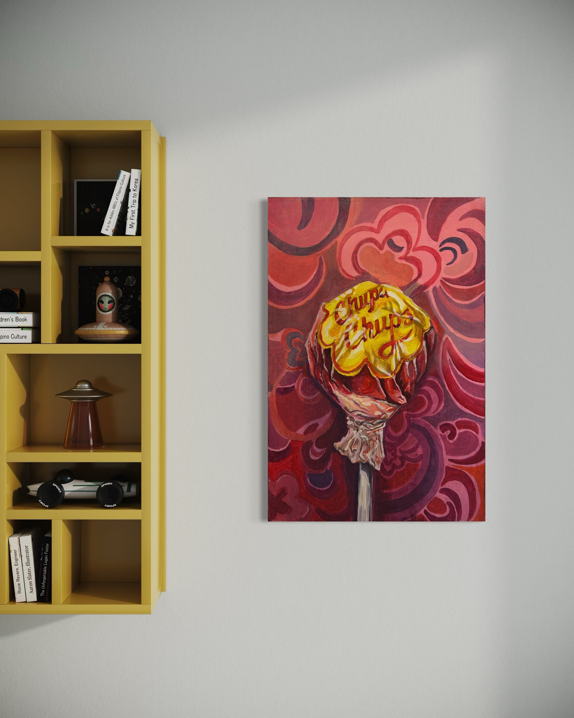 Nicola Osbourne’s work sits comfortably within contemporary pop-influenced painting, blending everyday objects with a bold, expressive painterly approach. Her style often elevates familiar items into icons, using simplified forms, strong outlines, and confident brushstrokes to keep the imagery accessible and immediate. Rich, saturated colour palettes and swirling or rhythmic backgrounds give the work a sense of movement and energy, while the subject matter remains recognisable and playful rather than overly complex.
