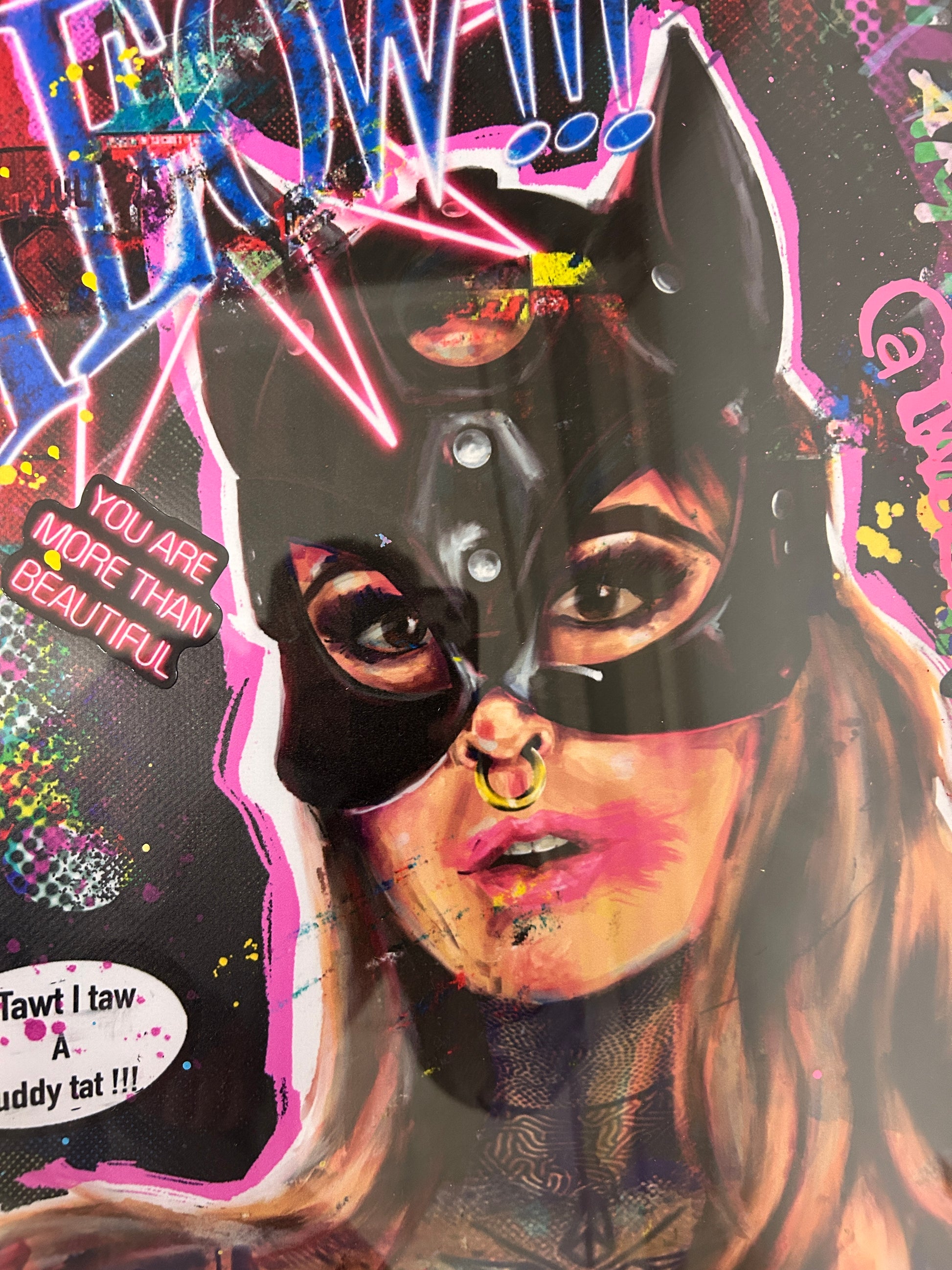 This framed piece portrays a striking female figure dressed in a black cat mask, reminiscent of both comic book anti-heroines and fetish-inspired costuming. Her chest and shoulders are tattooed with elaborate designs, blending urban ink culture with pop surrealism. The background is a chaotic tapestry of neon colors, graffiti splatters, stenciled patterns, and comic strip-style typography.