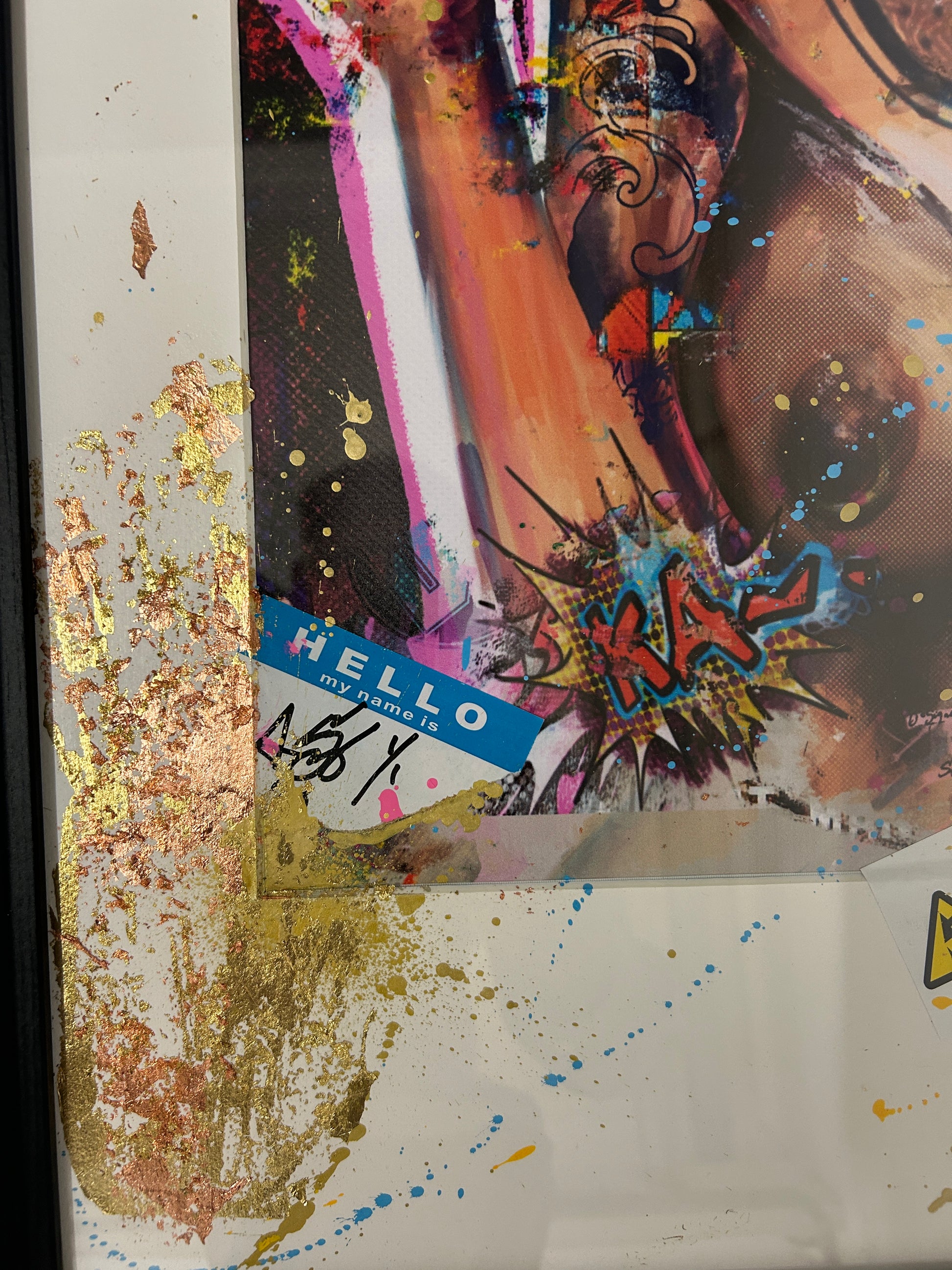 Drips of paint and scattered overlays of text, warning signs, and scribbles give the work an urban, gritty quality — as though it could be found on a city wall layered with posters, tags, and street murals. Gold-leaf-like textures break through in places, contrasting raw graffiti with a hint of opulence.