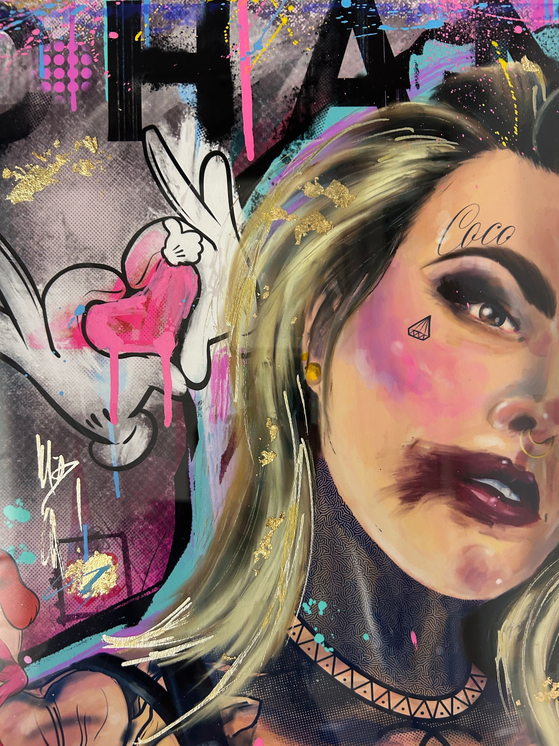 The background is an explosive mix of neon pinks, purples, and gold accents layered with graffiti tags, playful doodles, and cartoonish figures. Luxury fashion branding appears subtly woven in — the word CHANEL floats across the top, hinting at consumerist critique. Smaller illustrated figures, hearts, and mischievous cartoon characters surround the central subject, creating a sense of chaotic excess.