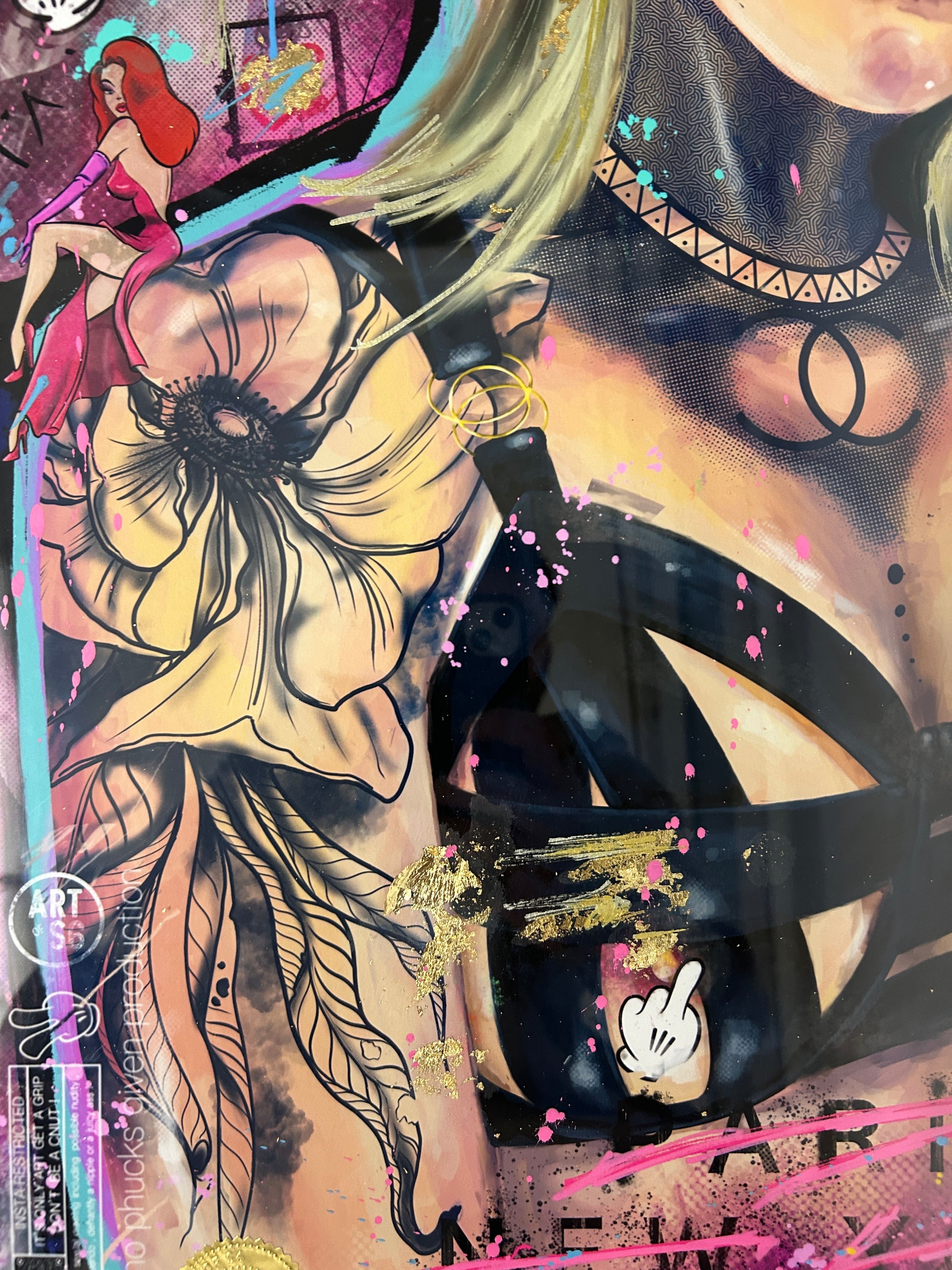 his piece presents a striking blonde woman in a bold, strappy black outfit that exudes both dominance and glamour. Her intense gaze and heavy makeup are framed by flowing hair and tattooed shoulders, blending elements of pin-up, punk, and alternative fashion. A comic-style speech bubble declares: “I’m so BAD! I’m just drawn that way!!” — an ironic play on femme fatale tropes and the hyper-sexualized way women are often depicted in pop culture.