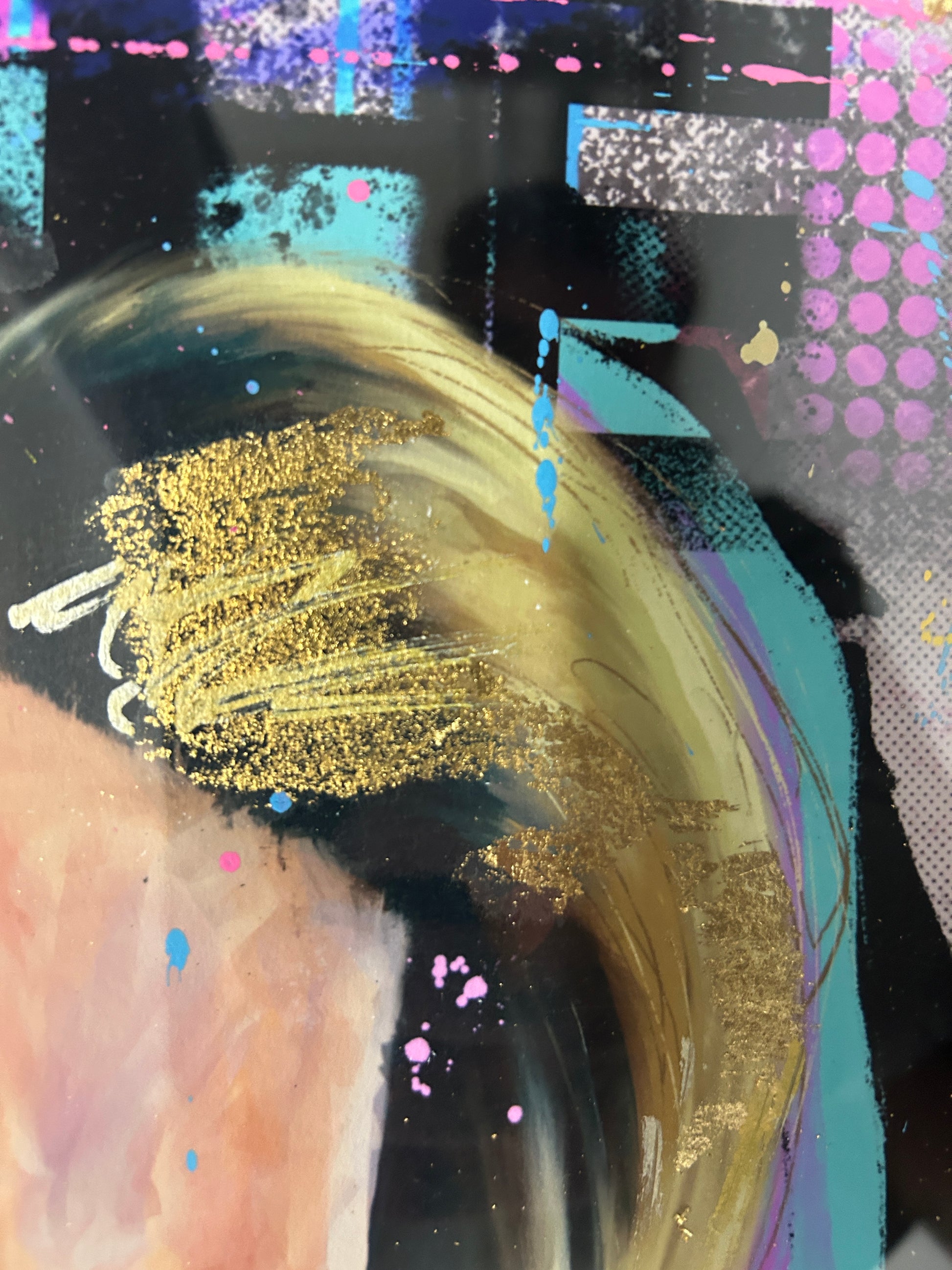 Gold-leaf-like fragments shimmer among the graffiti textures, while scrawled text and sticker motifs ground the piece firmly in the aesthetic of street culture.