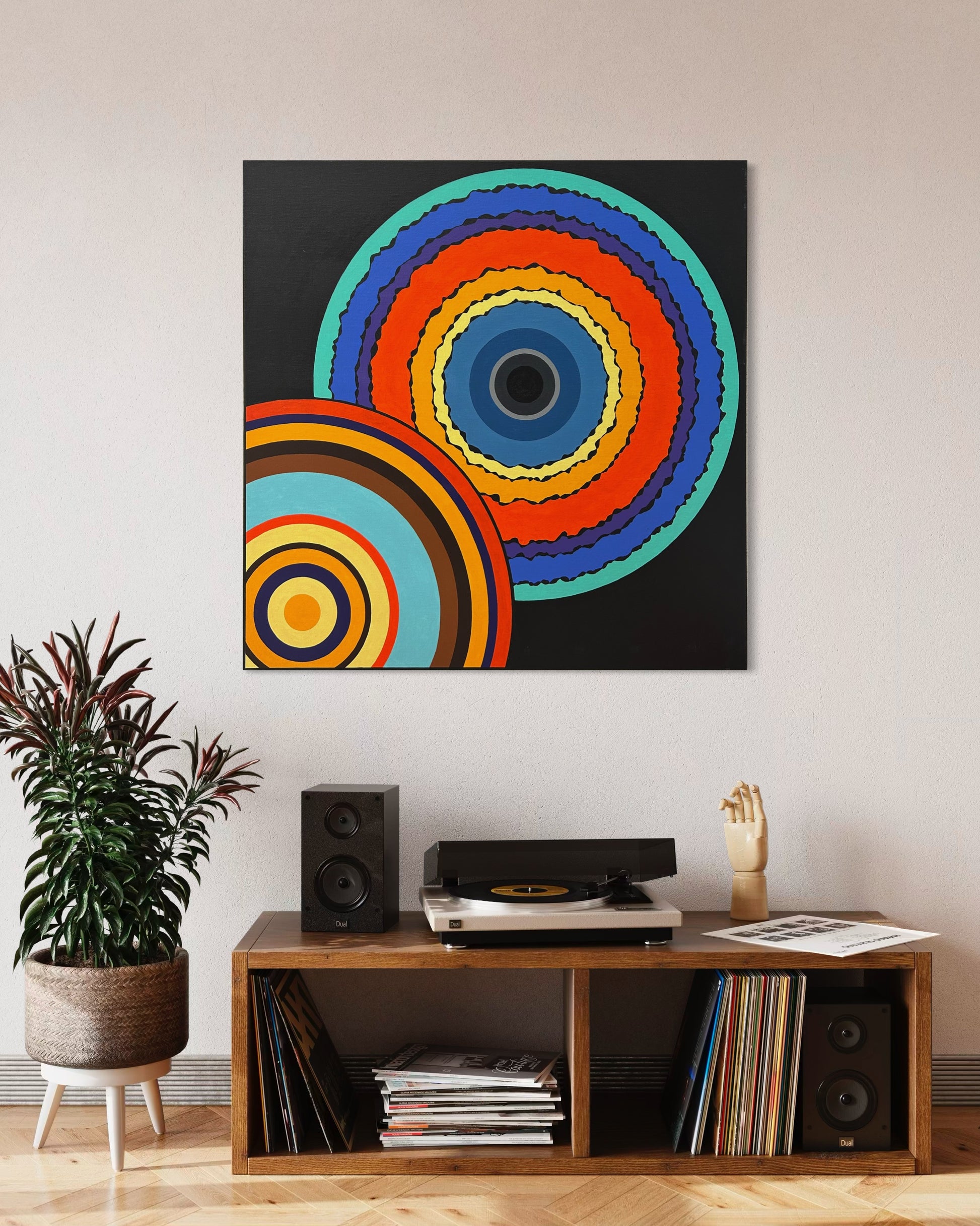Rebecca Coleman’s work explores contemporary geometric abstraction through carefully balanced color, rhythm, and form. Each composition is entirely hand-painted, created without the use of tape or mechanical guides, allowing subtle human variation to remain visible within the precision of the geometry. This approach brings warmth and movement to structured patterns, creating a quiet tension between control and intuition.