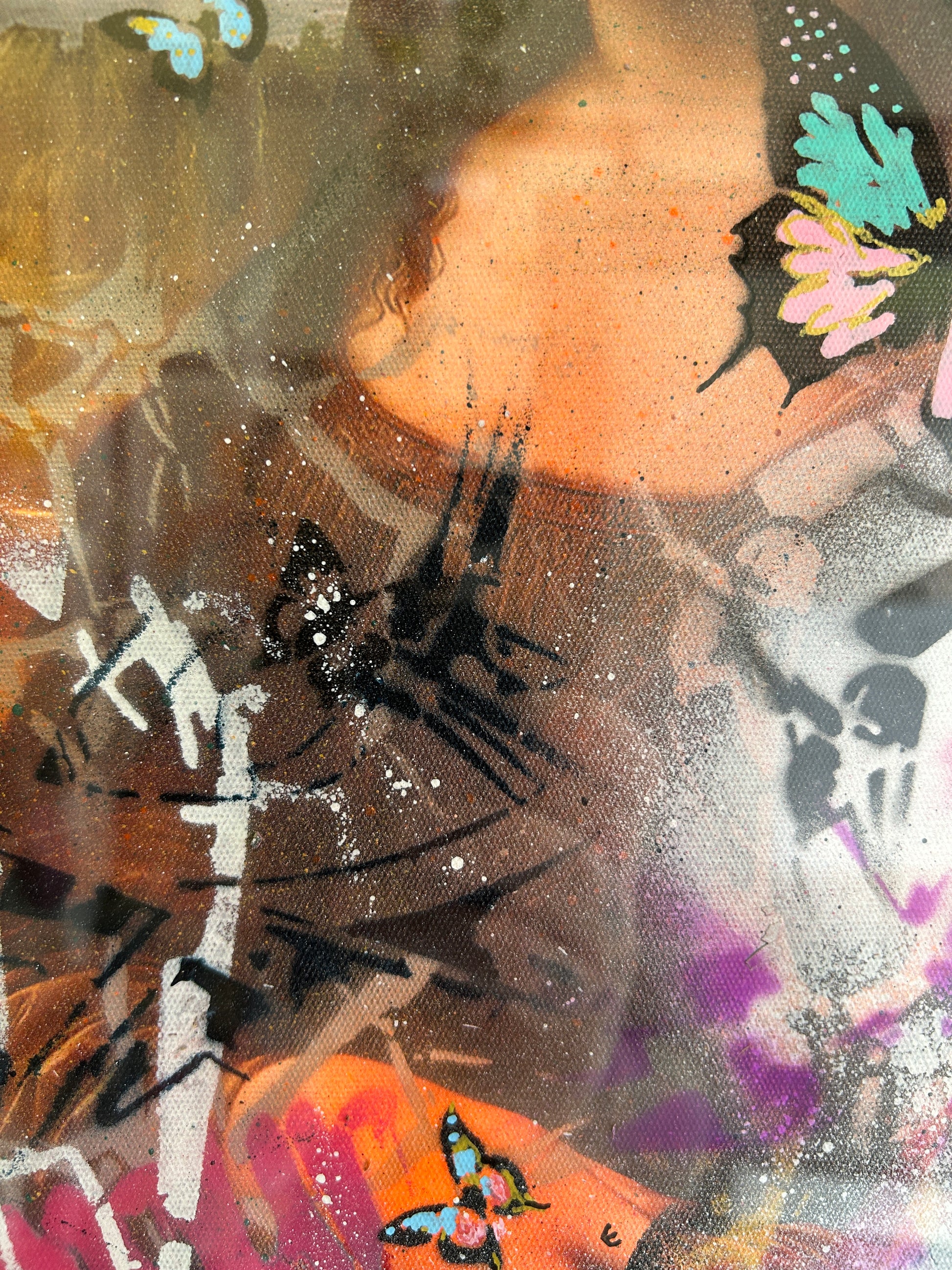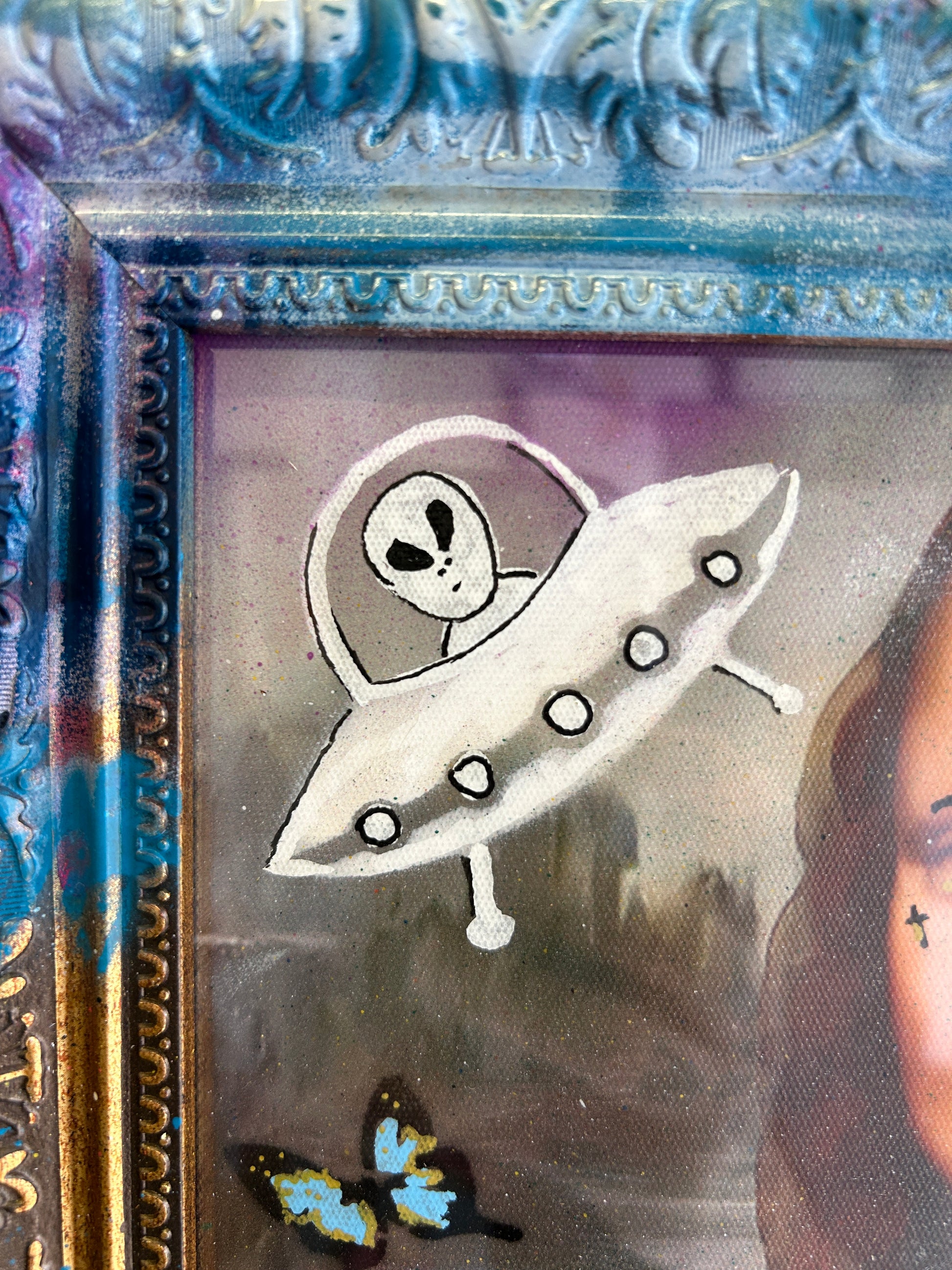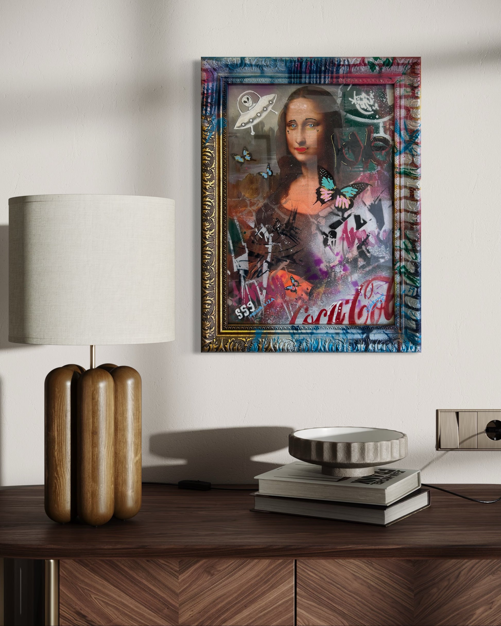A contemporary street art reinterpretation of the iconic Mona Lisa, infused with bold graffiti, butterflies, and playful pop culture elements. The vibrant mix of spray-painted colors, UFO motifs, and layered stencils transforms the timeless masterpiece into a striking modern statement. Set in a richly decorated frame, this artwork blends classical elegance with urban rebellion, making it a standout piece for eclectic and stylish interiors.