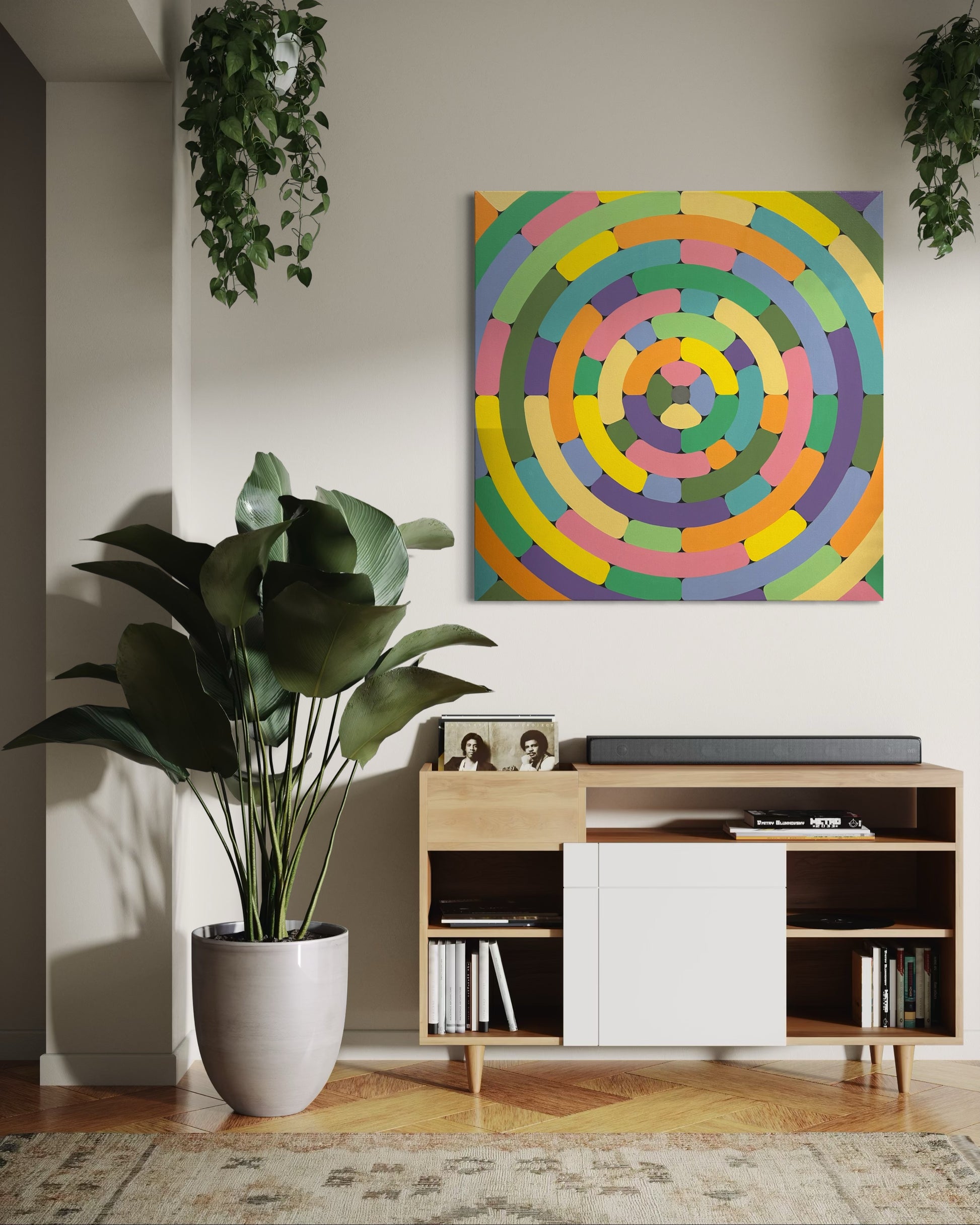 Rebecca Coleman’s work explores contemporary geometric abstraction through carefully balanced color, rhythm, and form. Each composition is entirely hand-painted, created without the use of tape or mechanical guides, allowing subtle human variation to remain visible within the precision of the geometry. This approach brings warmth and movement to structured patterns, creating a quiet tension between control and intuition.